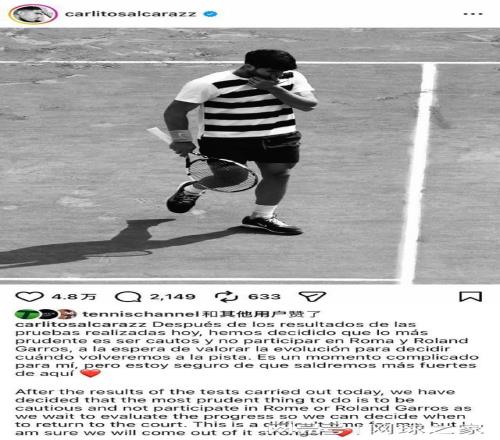 “经过今天的检查评估后,我决定谨慎起见,退出罗马大师赛与法网赛事。我将观察身体恢复情况,再确定回归赛场的时间。现在我的处境有些艰难,但我坚信我们会变得更强大。”当阿尔卡拉斯通过个人社交媒体官宣退出法网时,这件事并非令舆论哗然的原因是,这个结果很多人早已经猜到了,西班牙人是聪明人,孰轻孰重,他心里非常清楚,自会做出正确的决定。